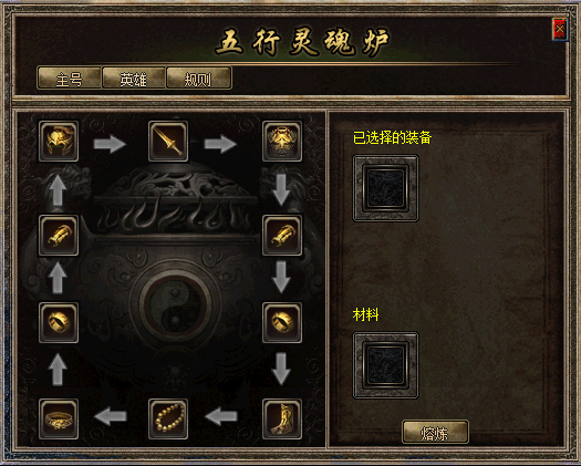 主号和英雄的装备均可进行熔炼,打开五行灵魂炉后可按照需求选择熔炼英雄或主号装备。