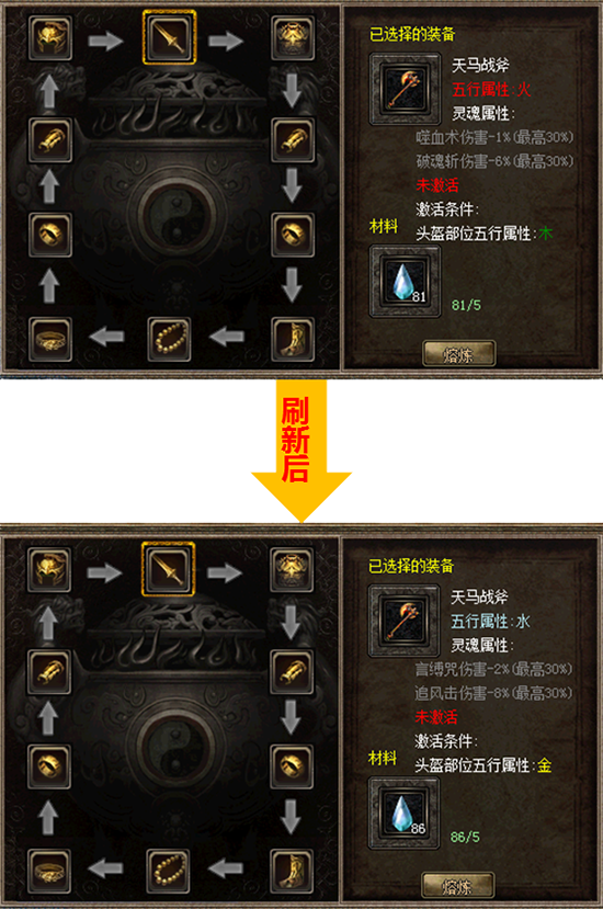 玛法勇士可在人物界面打开五行灵魂炉来重新熔炼装备,可修改装备原有的五行属性和灵魂属性。熔炼需要消耗灵魂石,熔炼后五行属性和灵魂属性均会改变。