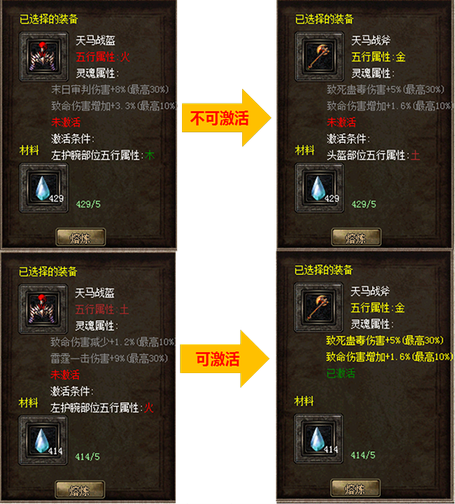 装备的五行属性对应并且部位顺序对应即可激活五行属性,享受灵魂属性加成。